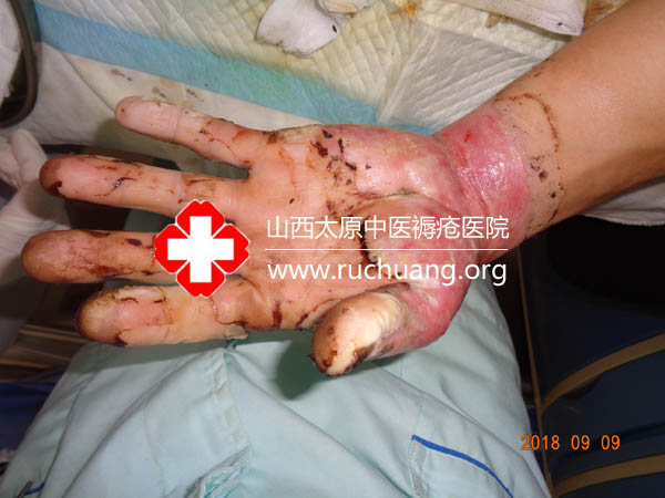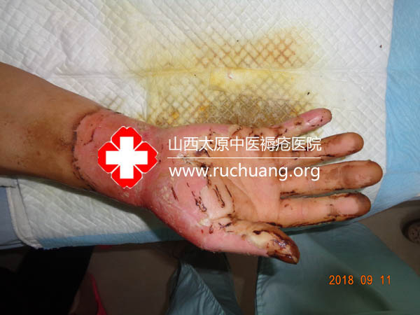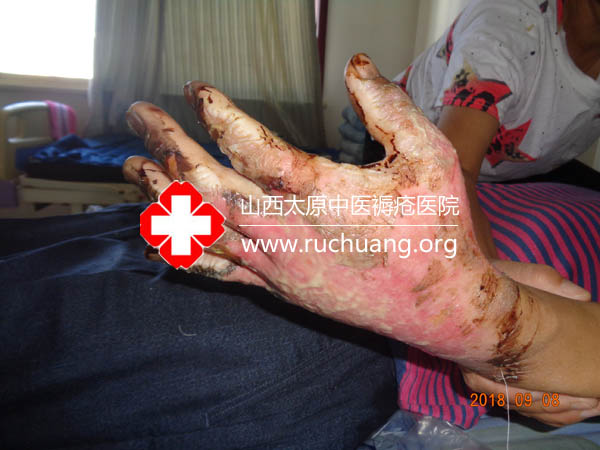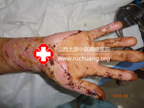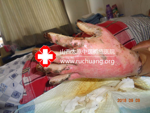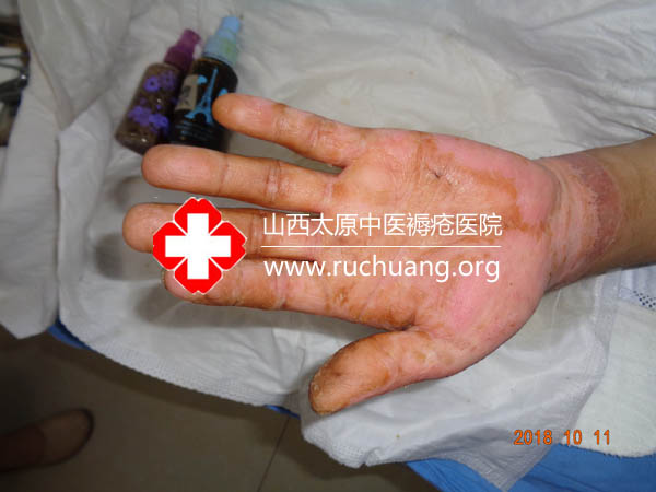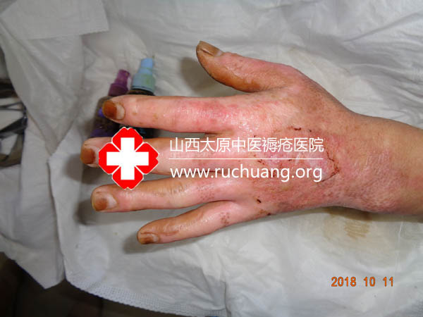 王某某,男,52岁,患者因脸部和双上肢电击伤在太钢医院治疗无果于2018年9月8日入住我科,治疗一个月,患者于10月11日治愈出院。