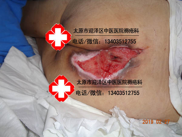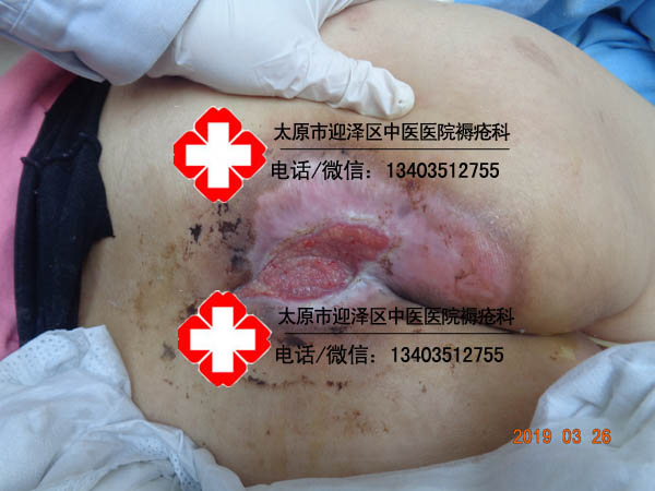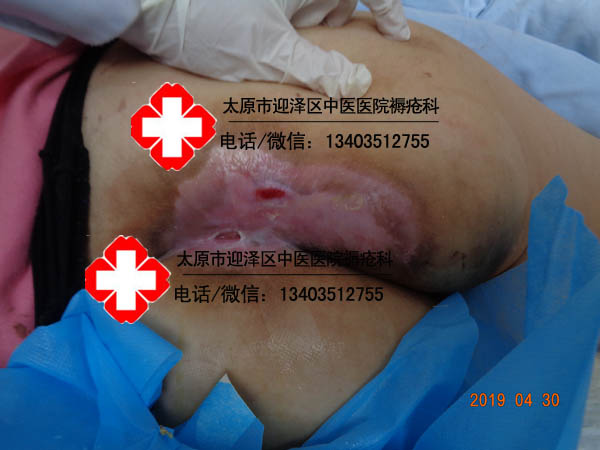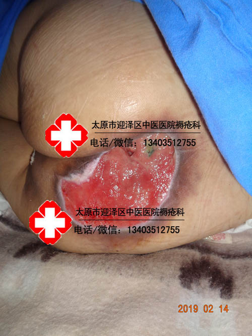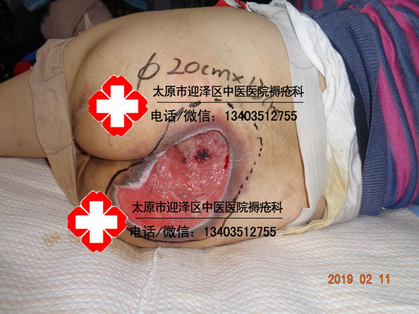 患者李某某,女,59岁,晋中市榆次区人。主诉骶尾部皮肤破溃3月,于2019年2月11日18时43分以轮椅推入我科.患者因腰椎骨折术后,导致长期卧床,加之护理不佳,伤口逐渐严重。伤口面积23×15cm,骶骨处可见大约3×2cm,深2cm,可触及骨头破损,骨质暴露,可见大量脓性分泌物,有异味,伤口四周皮肤发红,肿胀,皮温高。行中药硬膏热贴敷治疗拔毒去腐治疗,共计98天痊愈于2019年5月20日出院。