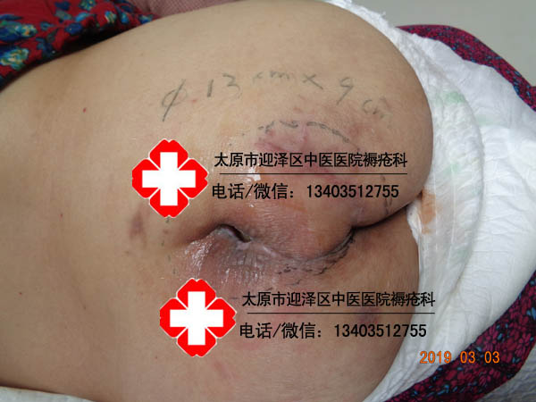 患者肖某某,女,76岁,山西阳曲县人。因“脑梗死、脑萎缩”出现行动不便后卧床,于2018年10月发现骶尾部溃烂,护理不佳加之营养状况差,导致伤口加重,迁延不愈,于2019年3月3日入住我科,专科检查骶尾部伤口外测面积约4×5cm,内测面积约13×9cm,最深达肛周,肛周10点方向可见黄豆大小破溃口,有大量脓性分泌物渗出,四周皮肤红肿,皮温较高。通过中药硬膏热帖敷治疗81天后伤口基本愈合出院。