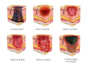 压疮是指身体局部组织长期受压、血液循环障碍、组织营养缺乏、使皮肤失去正常生理功能,而引起的组织破损和坏死。压疮最早也称为褥疮。由浅到深分为以下不同严重程度。