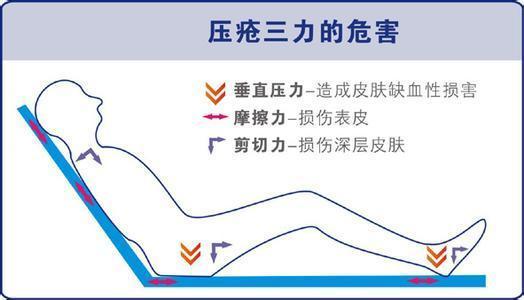 2、擦力和剪切力。平卧位需抬高床头,一般不应高于30度,协助翻身、更衣,换床单时,一定要抬高病人身体,避免拖拉等动作。使用便盆时,应协助病人抬高臀部,不可硬塞、硬拉,必要时在便盆边缘垫以软纸或布垫,防止擦伤皮肤。