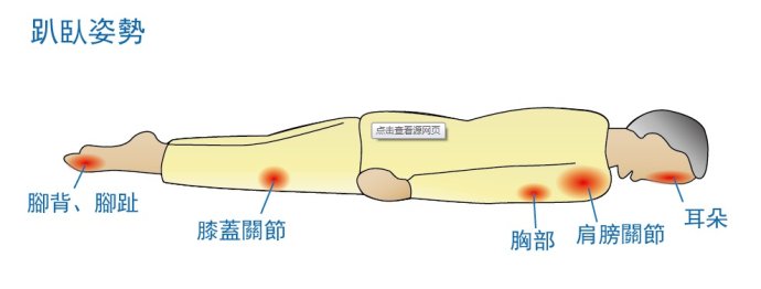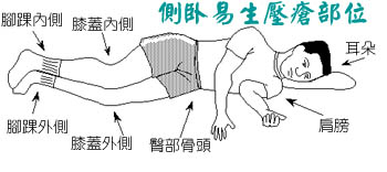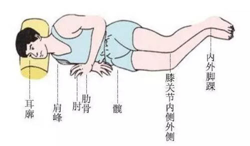 侧卧好发于:耳部、肩峰、肘部、髋部、膝关节内外侧、内外踝。