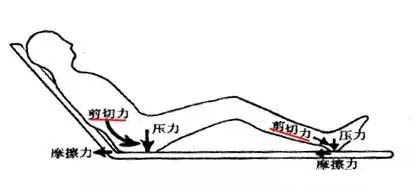 3、剪切力:是由摩擦力和压力相加而成,如病人平卧抬高床头时,身体下滑与床铺之间产生摩擦力,加上皮肤垂直方向的重力而导致剪切力的产生,引起局部皮肤血液循环障碍而发生压疮。