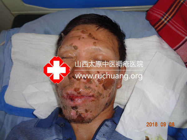 王某某,男,52岁,患者因脸部和双上肢电击伤在太钢医院治疗无果于2018年9月8日入住我科,治疗一个月,患者于10月11日治愈出院。